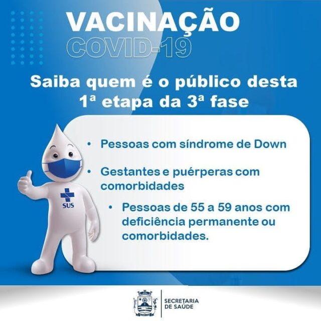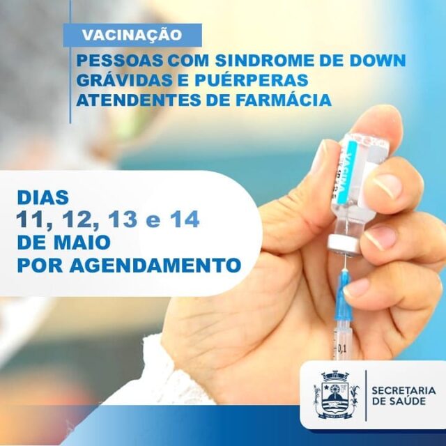 A campanha de vacinação contra a Covid-19 terá uma nova rodada em Valença com a imunização de pessoas com síndrome de down, gravidas e puérperas (mulher que acabou de dar à luz), atendentes de farmácia e pessoas de 55 a 59 anos com deficiência permanente ou comorbidades.