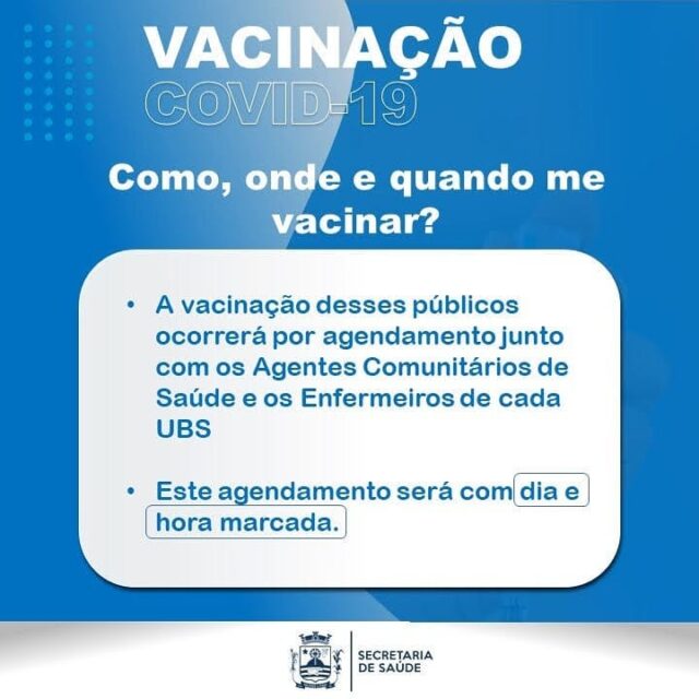A imunização começa nessa terça-feira (11) e se estenderá até sexta-feira (14), por agendamento. A vacinação desses públicos acorrerá por agendamento junto com os Agentes Comunitários de Saúde e os enfermeiros de cada Unidade Básica de Saúde.