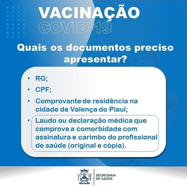 Os documentos necessários são: RG, CPF, comprovante de residência e laudo ou declaração medica que comprove a comorbidades com assinatura e carimbo do profissional de saúde originais e copias. Os públicos foram definidos pela Sesapi.