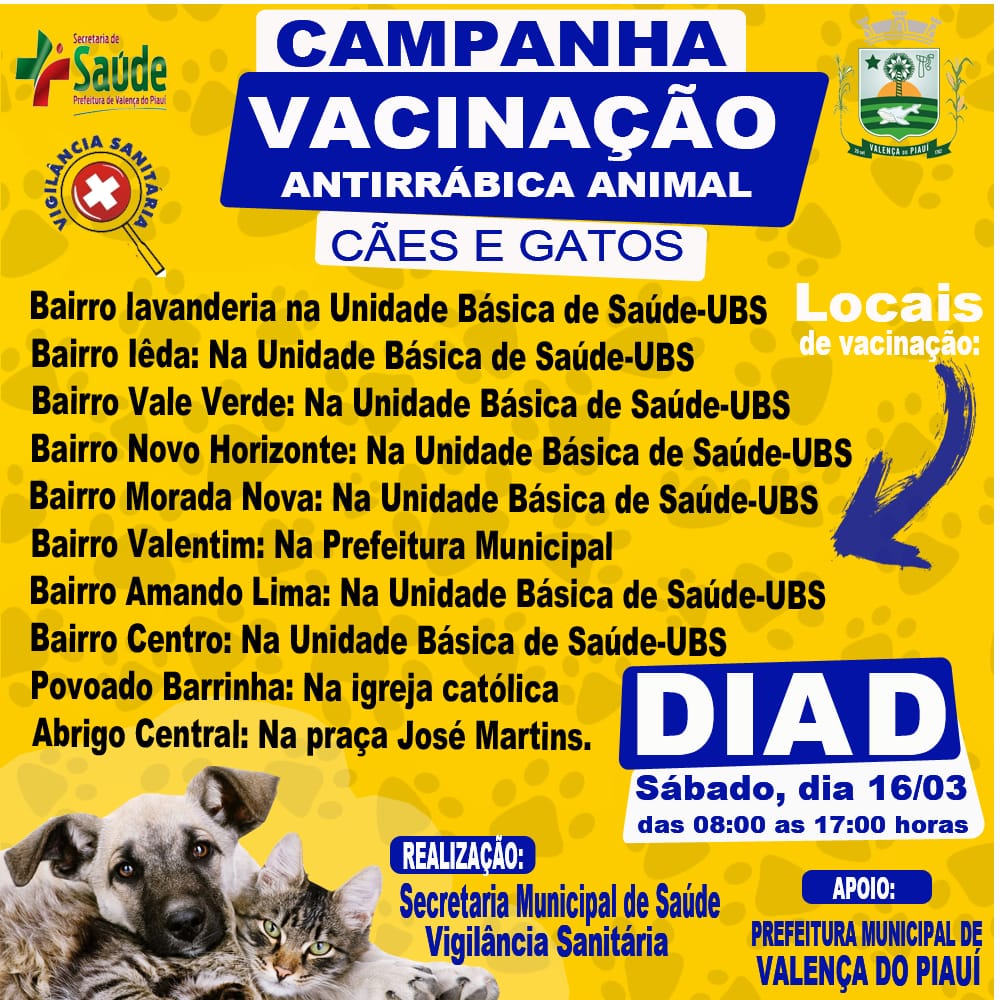 A Secretaria de Saúde de Valença, por intermédio da Vigilância Sanitária realizará no próximo dia 16 de março, a Campanha de Vacinação Antirrábica Animal para cães e gatos.
