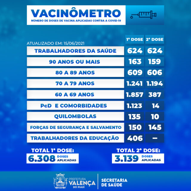 A Secretaria de Saúde de Valença do Piauí atualizou, nesta terça-feira, 15 de junho, números que mostram que 9.447 valencianos já foram vacinados no município desde o início da imunização.