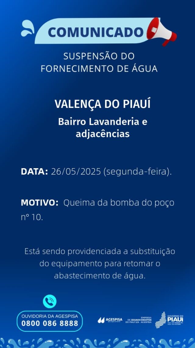 O fornecimento de água será interrompido em alguns bairros na cidade de Valença do Piauí nesta segunda 26 de maio. A informação foi repassada pela Agespisa em Valença, que informou que o problema desta vez é no poço número 10 que atende o bairro Lavanderia e adjacências que teve a bomba do poço queimada. Ainda no comunicado a Agespisa informa que a troca da bomba está sendo providenciada.
