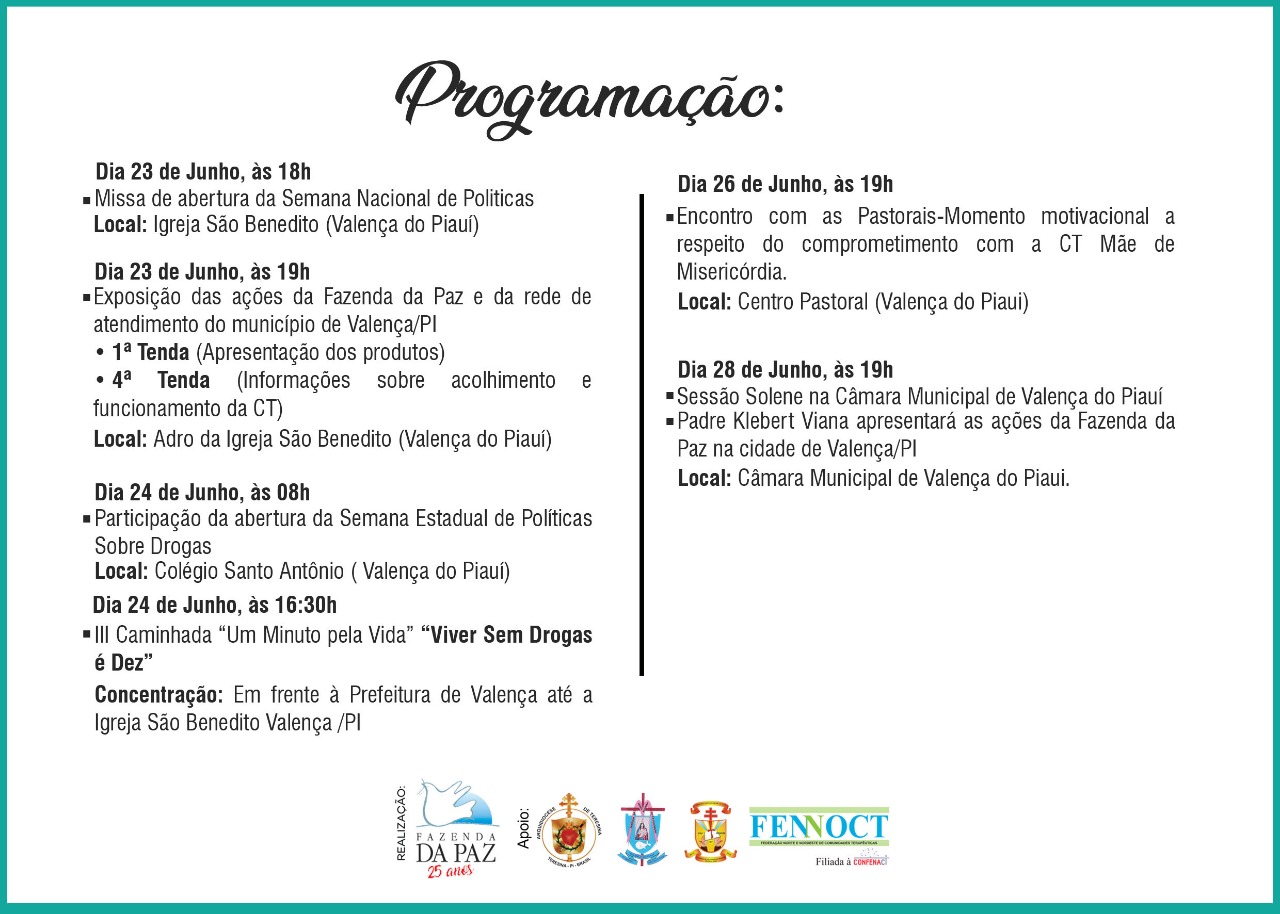 Nessa segunda-feira, além da solenidade de abertura aconteceu a 3ª edição da Caminhada da Fazenda da Paz pelas ruas de Valença. A solenidade contou com a presença de autoridades estaduais ligadas a Cendrogras e ao Conselho Estadual de Políticas Públicas Sobre Drogas, autoridades municiais como secretários municipais e vereadores como o vereador Rayonardo Mendes que juntamente coordenador municipal da juventude Dadvi Silva articularam a vinda do projeto a Valença.