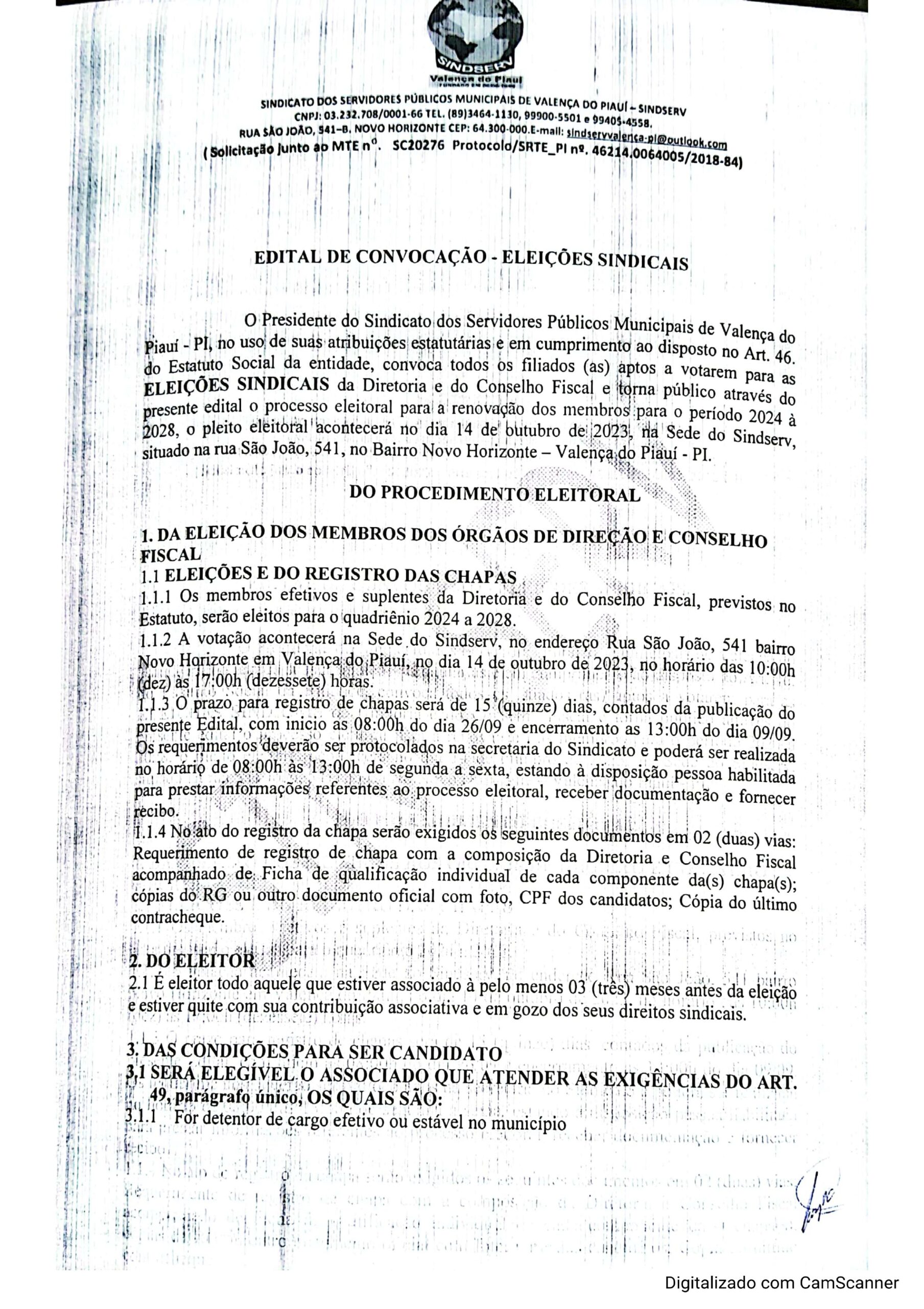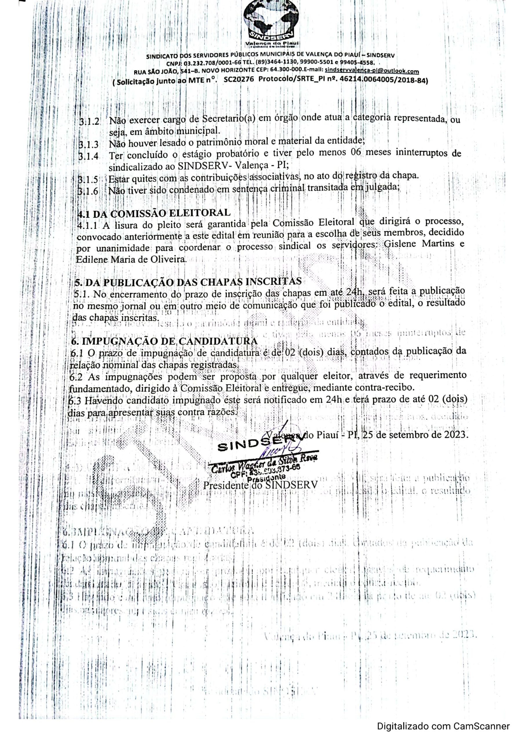 O Sindicato dos Servidores Públicos Municipais de Valença do Piaui (Sindserv) publicou o Edital de Convocação para as eleições do sindicato que acontecerá dia 14 de outubro em sua sede na rua São João, 541 no bairro Novo Horizonte das 10h às 17h, para o quadriênio 2024 a 2028.