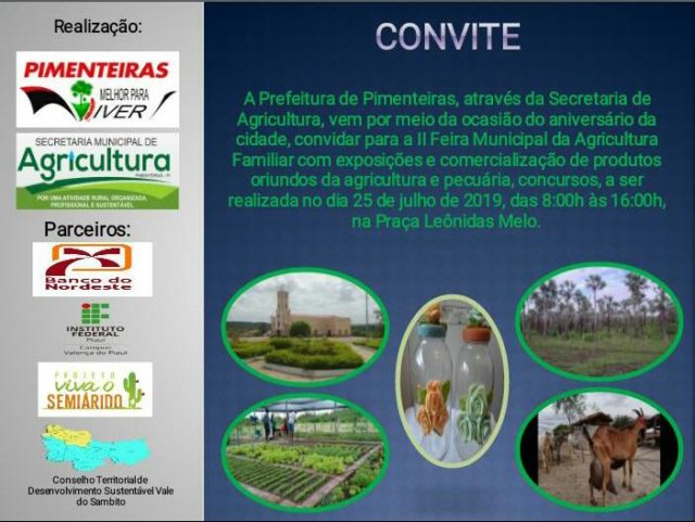 No dia 20, a Feira da Agricultura Familiar acontecerá na cidade de Santa Cruz dos Milagres e no dia 25 na cidade de Pimenteiras. As cidades de Inhuma e Novo Oriente ainda não definiram suas datas.