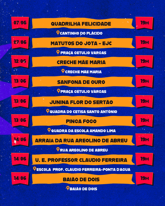 A Secretaria Municipal de Cultura de Valença divulgou o calendário oficial das apresentações juninas no município. Os festejos terão início no dia 7 de junho e seguirão até o começo de julho, prometendo movimentar a cidade com muito forró, cores e tradições nordestinas.