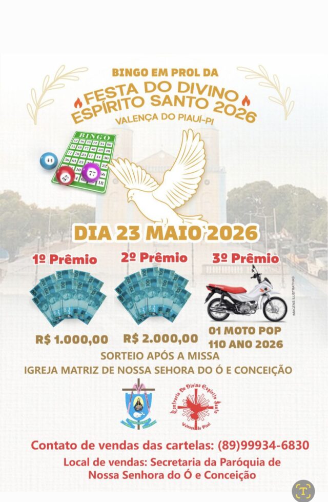 A Paróquia de Nossa Senhora do Ó e Conceição, em Valença do Piauí juntamente com a Confraria do Divino anunciou a realização de um grande bingo como parte das ações em prol da Festa do Divino Espírito Santo 2026. O evento está marcado para o dia 23 de maio, após a Santa Missa na igreja matriz.