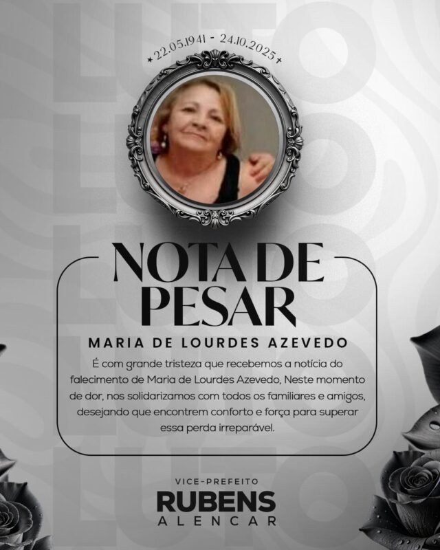 O prefeito Marcelo Costa e o vice-prefeito Rubens Alencar lamentaram o falecimento por meio de nota, destacando o legado e o respeito que Dona Lourdes conquistou ao longo da vida. O velório acontece na residência do seu filho, Iran das Baterias, localizada na Rua Cícero Portela, em Valença do Piauí.