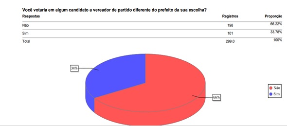 A pesquisa avaliou, ainda, o índice da escolha dos candidatos a vereadores, se o eleitor votaria ou não no vereador de partido diferente do prefeito da sua escolha. Conforme os dados do Instituto All Senso Pesquisa e Consultoria, 66,22% não votaria e 33,78% votaria em outro partido que não fosse de sua escolha.