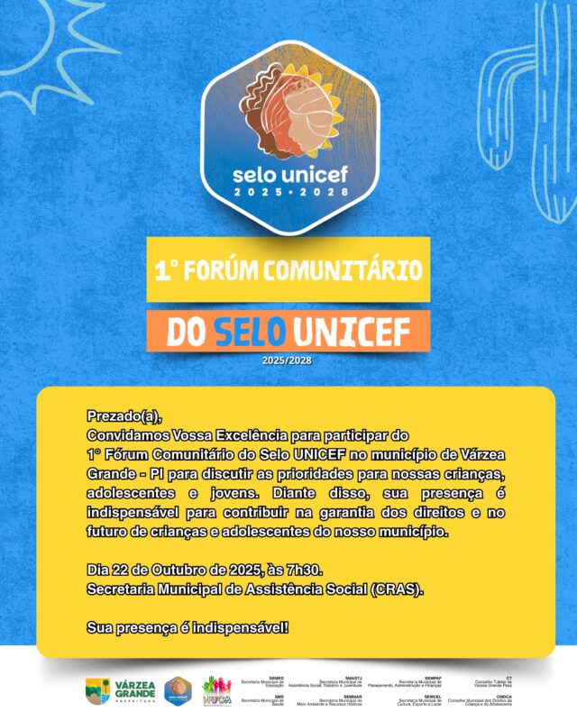 O município de Várzea Grande do Piauí se prepara para realizar o 1º Fórum Comunitário do Selo UNICEF – Edição 2025-2028, um importante momento de mobilização social em prol das políticas voltadas à infância e adolescência. O evento acontecerá no dia 22 de outubro de 2025, a partir das 08h, na Secretaria Municipal de Assistência Social (CRAS).