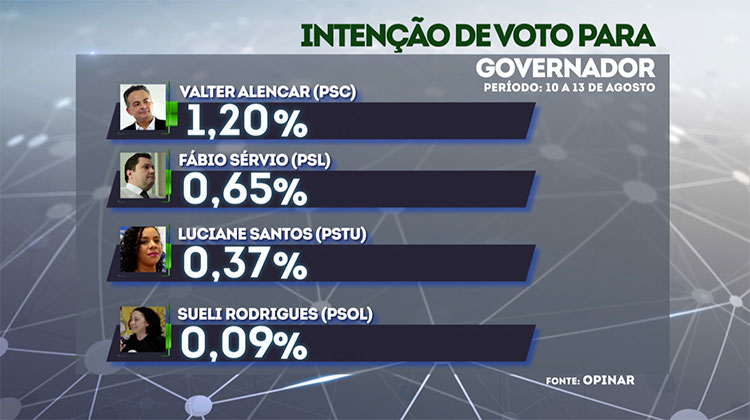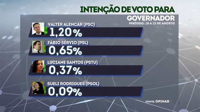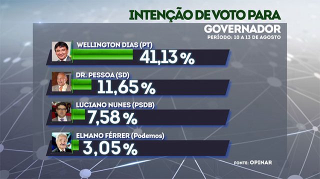 A terceira rodada de pesquisa Opinar mostra a liderança do governador Wellington Dias (PT), que tenta a reeleição, com 41,13% das intenções de voto. O governador é o candidato que mais registrou queda no percentual de votos, saindo de 50%, na primeira pesquisa, para 41%.